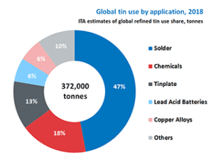 The fifteenth annual tin use survey carried out by the International Tin Association (ITA) showed refined tin use grew by 2% in 2018 but points to a contraction of -2% in 2019. 141 companies took part, accounting for some 43% of estimated global refined tin use in 2018.